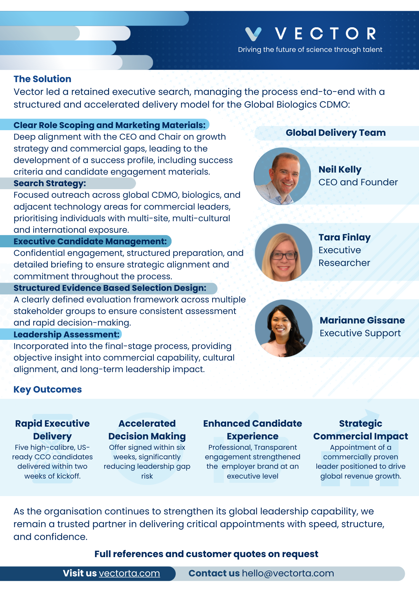 Vector specialises in executive search for life sciences, biotech, and CDMO organisations, delivering senior commercial and leadership talent globally. Our data-driven, evidence-based approach ensures faster hiring, stronger alignment, and measurable business impact.